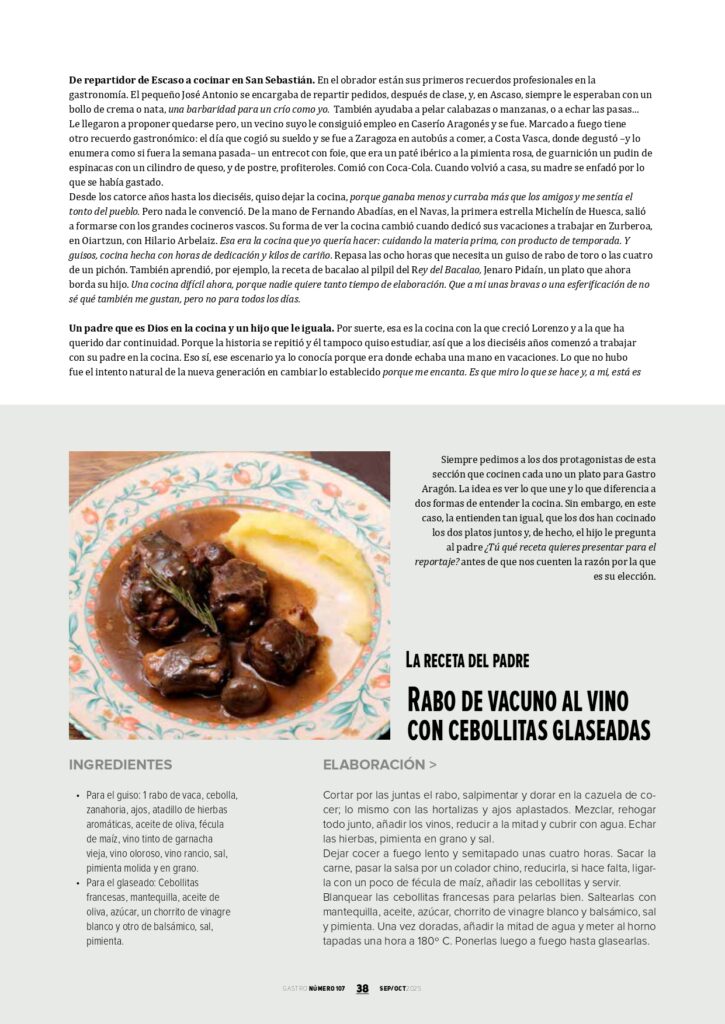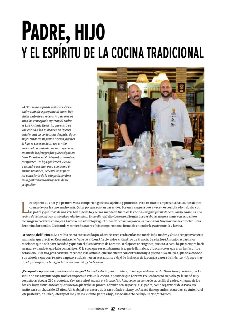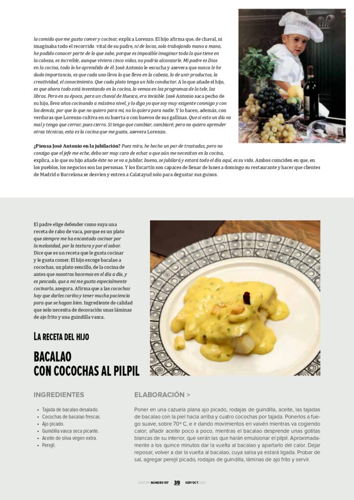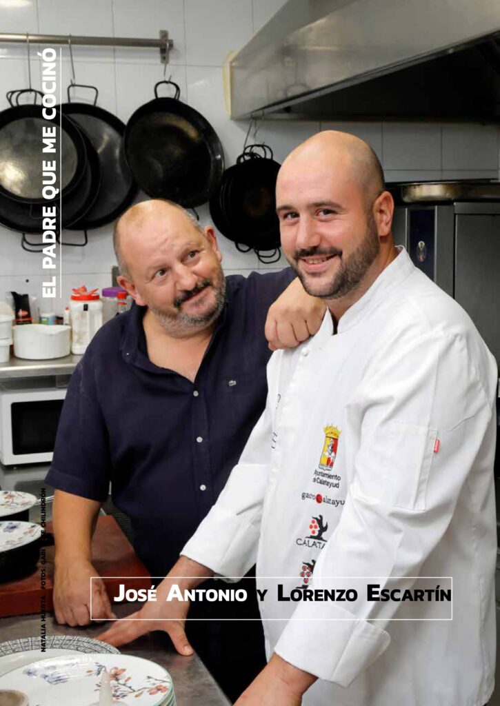 «A Dios no se le puede mejorar» dice el padre cuando le pregunto al hijo si hay algún plato de su recetario que, con los años, ha conseguido superar. El padre es José Antonio Escartín, que entró en una cocina a los 14 años en su Huesca natal y, casi cinco décadas después, sigue disfrutando de su pasión por los fogones. El hijo es Lorenzo Escartín, el niño ilusionado vestido de cocinero que se ve en una de las fotografías que cuelgan en Casa Escartín, en Calatayud, que ambos comparten. Un hijo que creció viendo a su padre cocinar, pero que, como élmismo reconoce, necesitó años para ser consciente de la alargada sombra en la gastronomía aragonesa de suprogenitor.